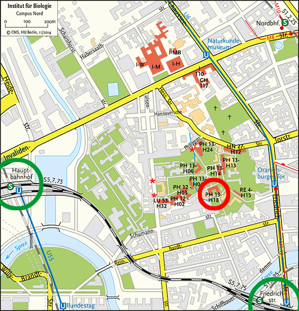 The red circle highlights Michaelis-Menten-Haus (street address: Philippstrasse 13, Haus 18, 10115 Berlin) that houses our lecture hall.